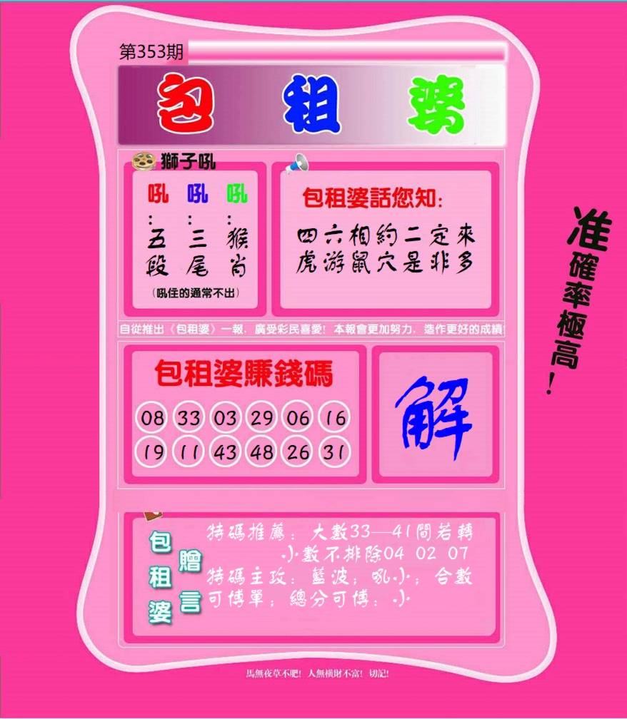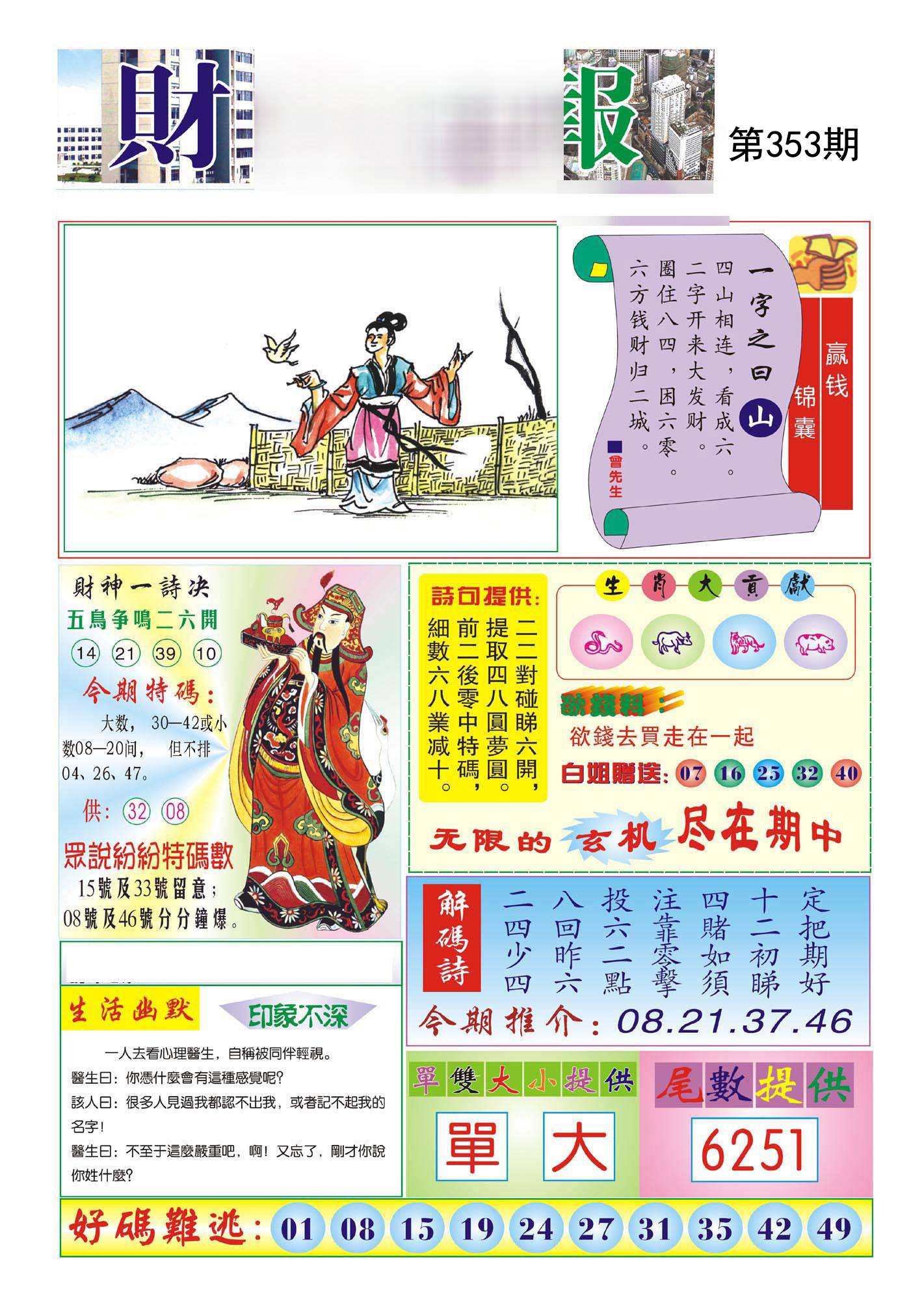 353期原创20码中特开:?00 19,20,31,38,46,07,32,29,01,16 15,45,30,08,11,04,44,35,27,23 |
